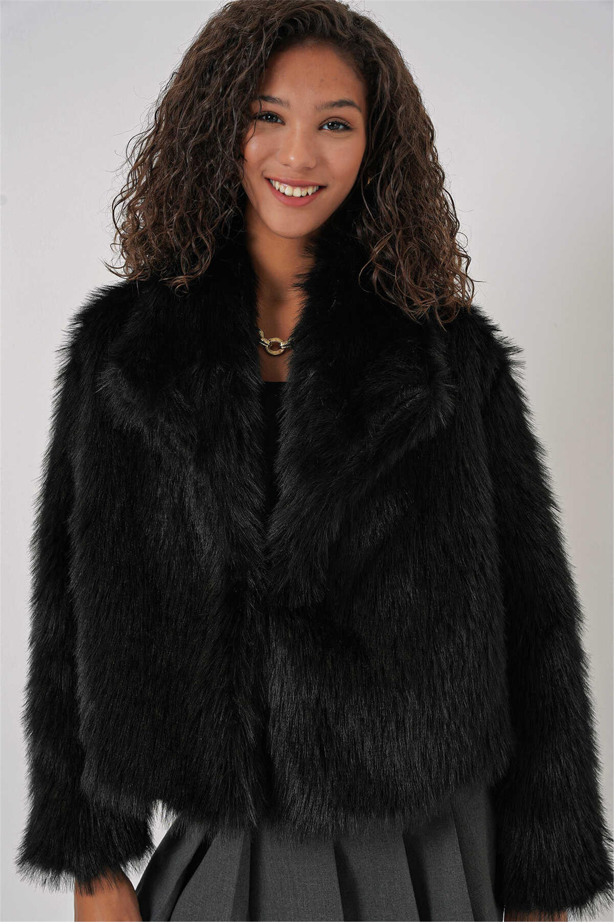 Bıgdart K26 5186 Sıyah Kadın Kruvaze Pelus Kurk Kaban