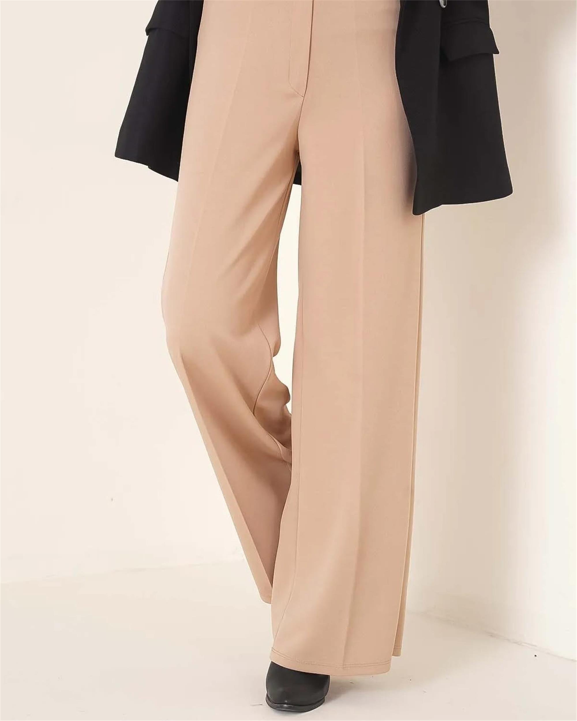 Canseven 1040 Bej Kadın Kemerli Bol Paça Yüksek Bel Likralı Scuba Krep Kumaş Pantolon (09.01.27.20340)