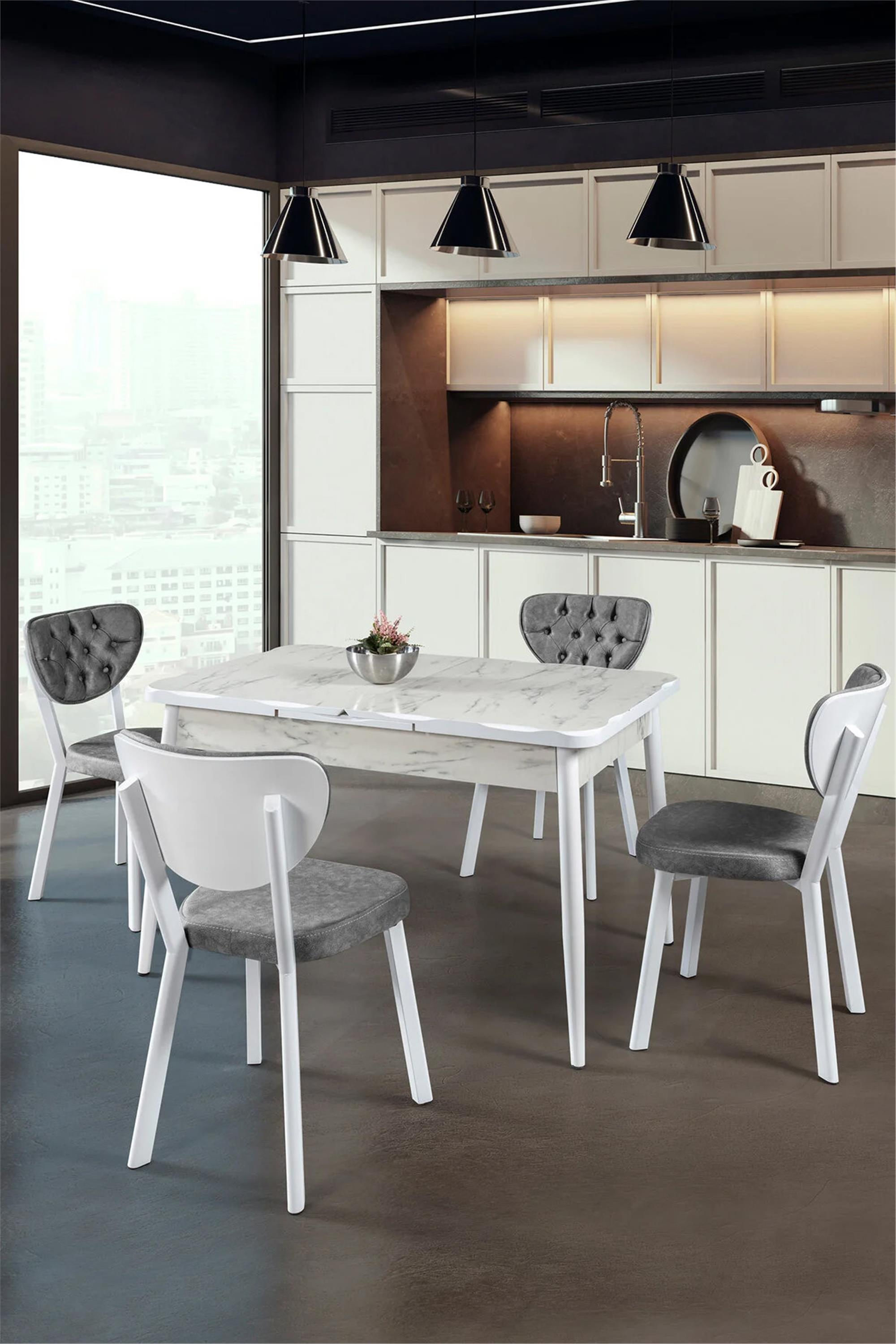 Takım İçeriği: 1 Masa (Açılır) + 4 SandalyeMasa Üst Tabla Malzemesi: Lak PanelMasa Üst Tabla Renk/Deseni: MarmoMasa Ayak Rengi: BeyazMasa Ayak Malzemesi: MetalSandalye Kumaş İçeriği: Gri Nubuk KumaşSandalye İskelet Malzemesi: MetalBakım ve Temizlik Önerisi:Kullanılan kumaşların tamamı ithal silinebilir kumaşlardır.; Ürünümüz modüler olduğundan dolayı sağ veya sol köşe olarak değiştirilebilmektedir.; Sabunlu nemli bez ile silinebilir ve arkasından kurulayarak temizlik işlemi sonlandırılır.; Lekelere karşı dayanıklı ve son derece kaliteli kumaşlardır.; Temizlik esnasında kimyasal temizlik malzemesi kullanılması ürüne zarar verir ve kullanım ömrünü kısaltır.; Ürünün uzun süre suyla temas etmesinden kaçınınız.; Ölçüler:Masa Ölçüleri:Genişlik: 128 cm (Kapalı), 162 cm (Açık)Derinlik: 79 cmYükseklik: 75 cmSandalye Ölçüleri:Genişlik: 44 cmDerinlik: 44 cmYükseklik: 87 cmÖzel Ölçü:Ürün ölçüleri standarttır, özel ölçü seçeneği bulunmamaktadır.; Teslimat: Tüm kargo firmalarının 2016 yılının başında yapmış oldukları anlaşma gereği daire giriş kapısında teslim edilmektedir.; Köylere teslimat yapılmamaktadır.; Bazı şehir ve şehirlerin ilçelerinde nakliye sıkıntısı yaşanabilmektedir.; Bulunduğunuz bölge şehir merkezlerinden uzak ise, alışverişten önce lütfen müşteri temsilcilerimizle "Satıcıya Sor" kısmından iletişime geçiniz.; : Hasar tespit tutanağı bulunmayan ürünlerle ilgili veya değişim işlemleri yapılamamaktadır.; Garanti Bilgisi: Üretim ve işçilik hatalarını kapsayan 2 yıllık garanti ile ürünün konforunu içiniz rahat bir şekilde yaşayabilirsiniz.; Ürün, Avrupa TÜV CERT ISO 9001 kalite standardına uygun üretilmiştir.; Kurulum Hizmeti: Müşterilerimizin mağdur olmaması için ürünlerimizi kolay kuruluma özel tasarlamış bulunmaktayız.; Kolay kurulum dolayısıyla paketlerin içerisinde vidalar, aksesuarların montaj şeması ve uyumlu malzeme torbası yer almaktadır.