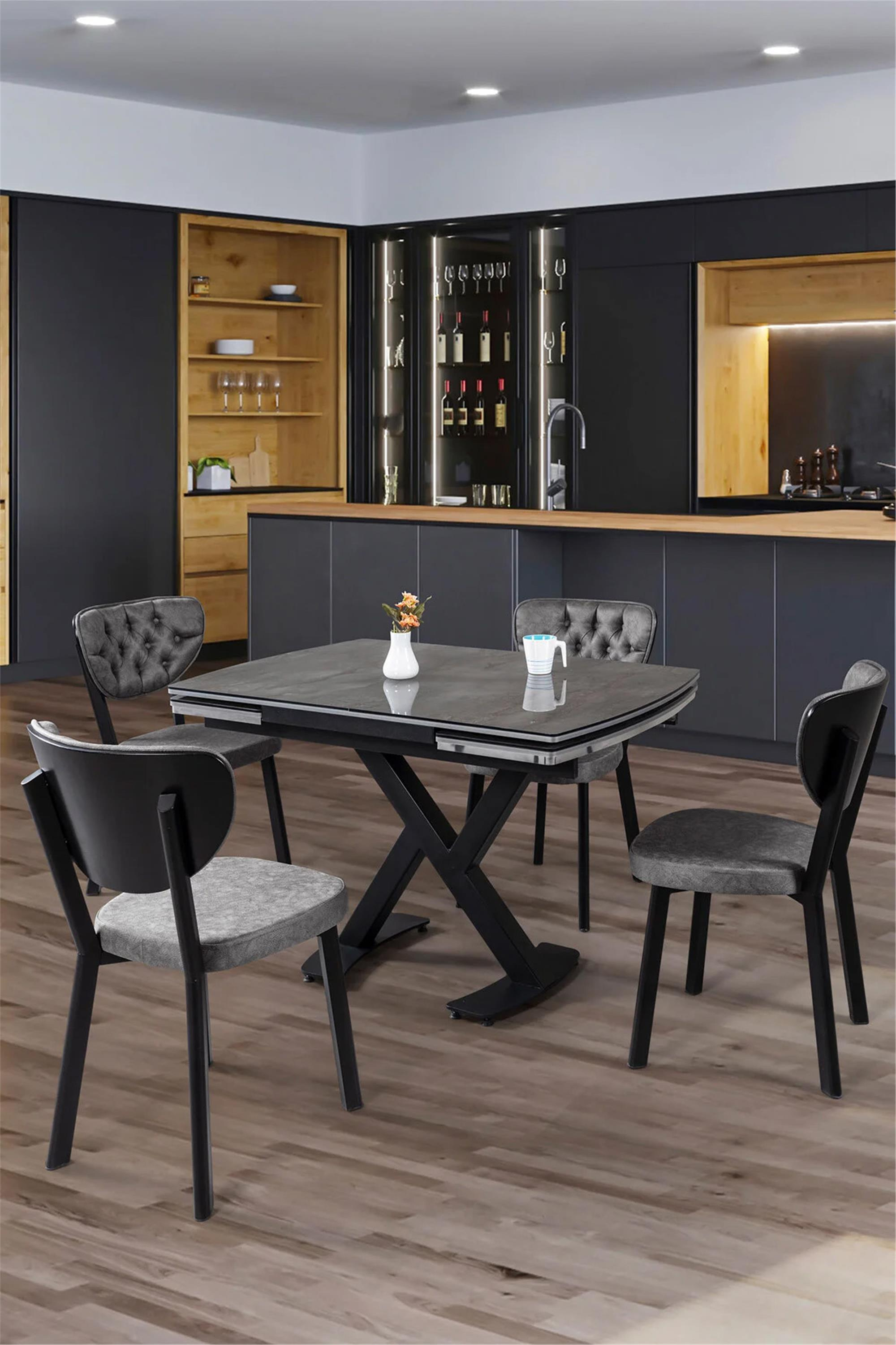 Takım İçeriği: 1 Masa (Açılır) + 4 SandalyeMasa Üst Tabla Malzemesi: Lak PanelMasa Üst Tabla Renk/Deseni: İronyMasa Ayak Rengi: SiyahMasa Ayak Malzemesi: MetalSandalye Kumaş İçeriği: Gri KumaşSandalye İskelet Malzemesi: MetalBakım ve Temizlik Önerisi:Kullanılan kumaşların tamamı ithal silinebilir kumaşlardır.; Ürünümüz modüler olduğundan dolayı sağ veya sol köşe olarak değiştirilebilmektedir.; Sabunlu nemli bez ile silinebilir ve arkasından kurulayarak temizlik işlemi sonlandırılır.; Lekelere karşı dayanıklı ve son derece kaliteli kumaşlardır.; Temizlik esnasında kimyasal temizlik malzemesi kullanılması ürüne zarar verir ve kullanım ömrünü kısaltır.; Ürünün uzun süre suyla temas etmesinden kaçınınız.; Ölçüler:Masa Ölçüleri:Genişlik: 120 cm (Kapalı), 181 cm (Açık)Derinlik: 80 cmYükseklik: 78 cmSandalye Ölçüleri:Genişlik: 44 cmDerinlik: 44 cmYükseklik: 87 cmÖzel Ölçü:Ürün ölçüleri standarttır, özel ölçü seçeneği bulunmamaktadır.; Teslimat: Tüm kargo firmalarının 2016 yılının başında yapmış oldukları anlaşma gereği daire giriş kapısında teslim edilmektedir.; Köylere teslimat yapılmamaktadır.; Bazı şehir ve şehirlerin ilçelerinde nakliye sıkıntısı yaşanabilmektedir.; Bulunduğunuz bölge şehir merkezlerinden uzak ise, alışverişten önce lütfen müşteri temsilcilerimizle "Satıcıya Sor" kısmından iletişime geçiniz.; : Hasar tespit tutanağı bulunmayan ürünlerle ilgili veya değişim işlemleri yapılamamaktadır.; Garanti Bilgisi: Üretim ve işçilik hatalarını kapsayan 2 yıllık garanti ile ürünün konforunu içiniz rahat bir şekilde yaşayabilirsiniz.; Ürün, Avrupa TÜV CERT ISO 9001 kalite standardına uygun üretilmiştir.; Kurulum Hizmeti: Müşterilerimizin mağdur olmaması için ürünlerimizi kolay kuruluma özel tasarlamış bulunmaktayız.; Kolay kurulum dolayısıyla paketlerin içerisinde vidalar, aksesuarların montaj şeması ve uyumlu malzeme torbası yer almaktadır.