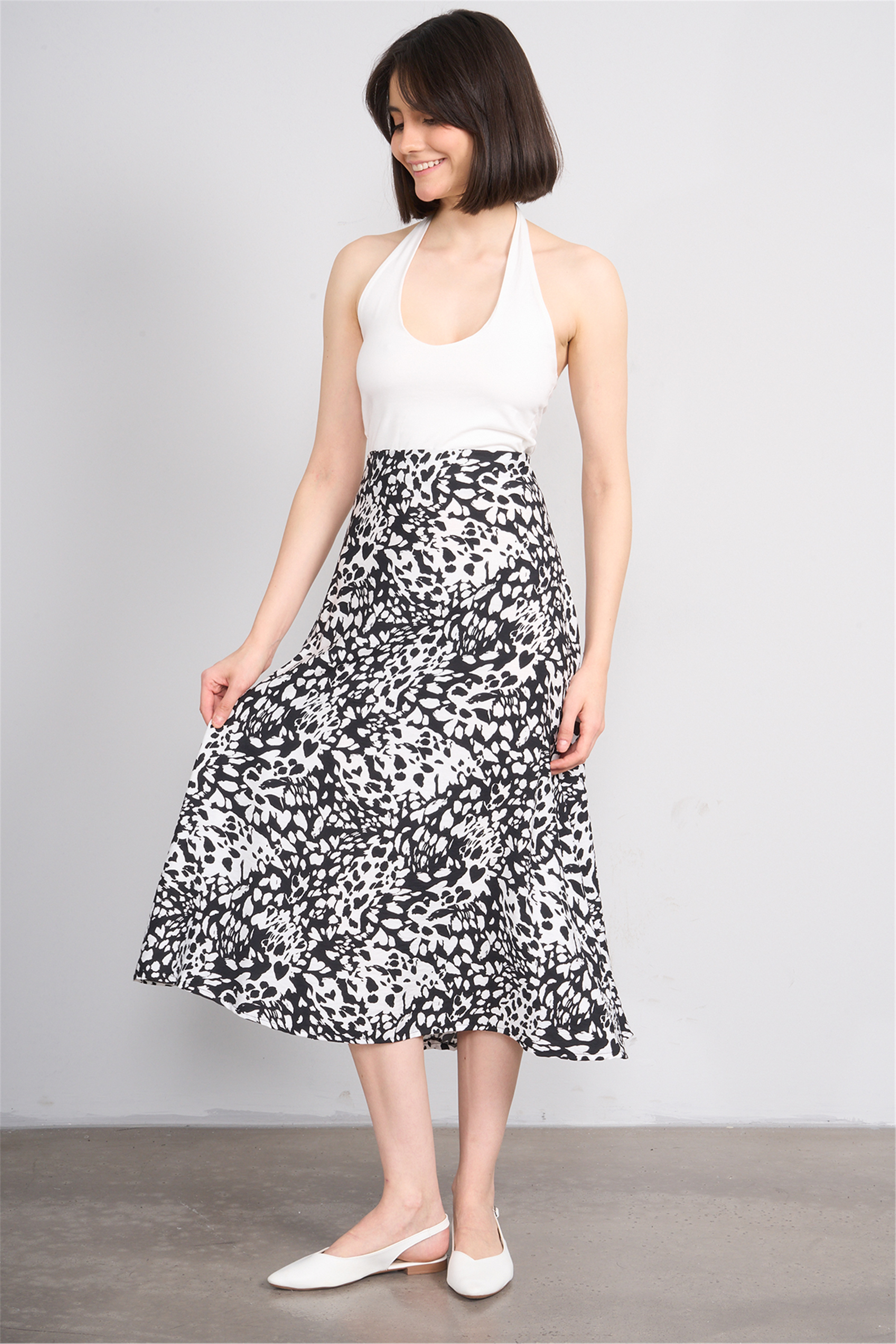 Fithit 4652 Bayan Viskon Regular Çan Etek Siyah Üzeri Kalpli Leopar Desen