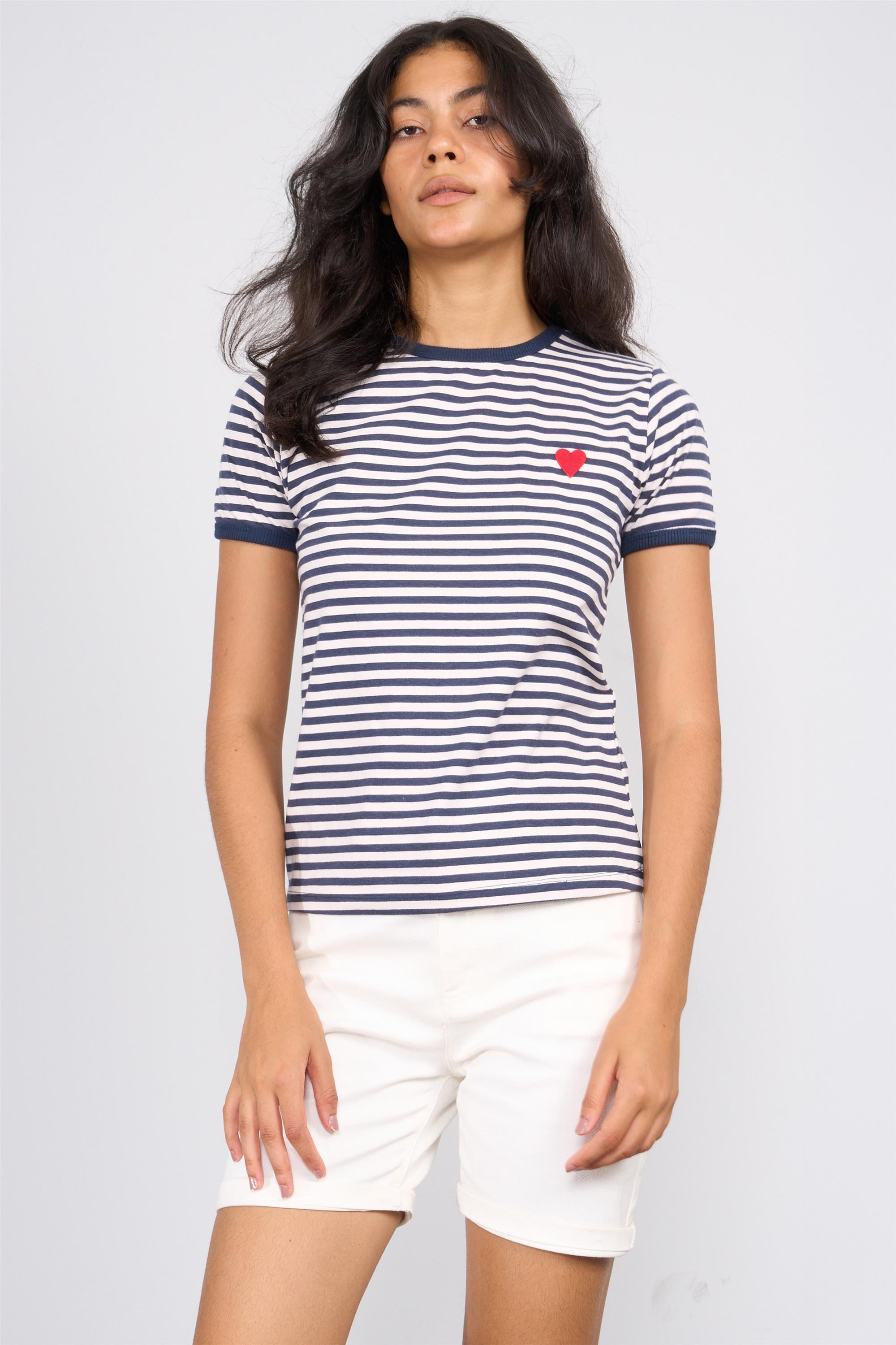 Helly Y25 Mb-6471 Lacıvert-Beyaz Kadın Kısa Kollu Cızgılı Kalplı T-Shırt (09.01.24.70039)