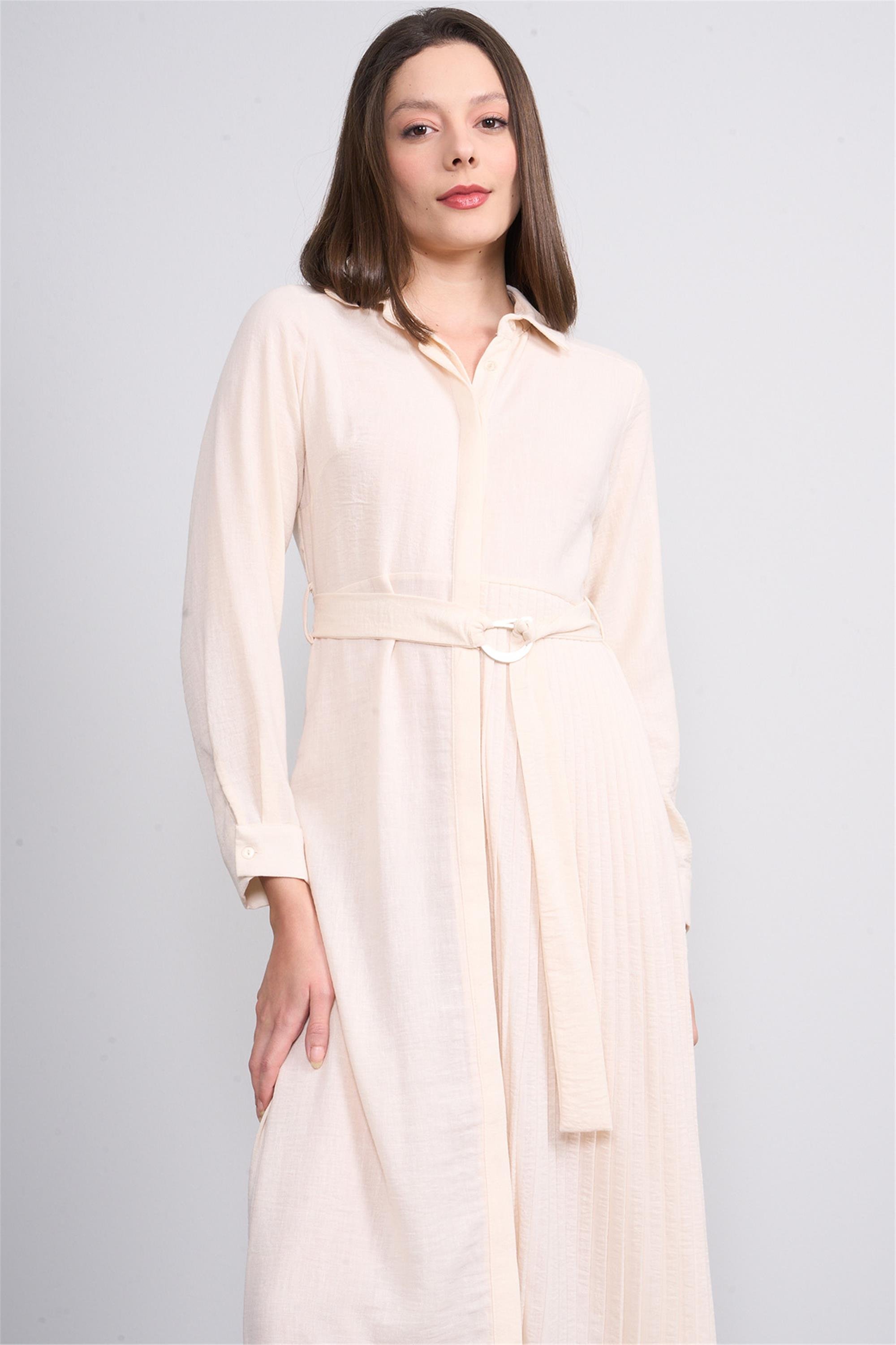 Helly Y25 Me-3863 Bej Kadın Gömlek Yaka Gızlı Patlı Midi Elbise