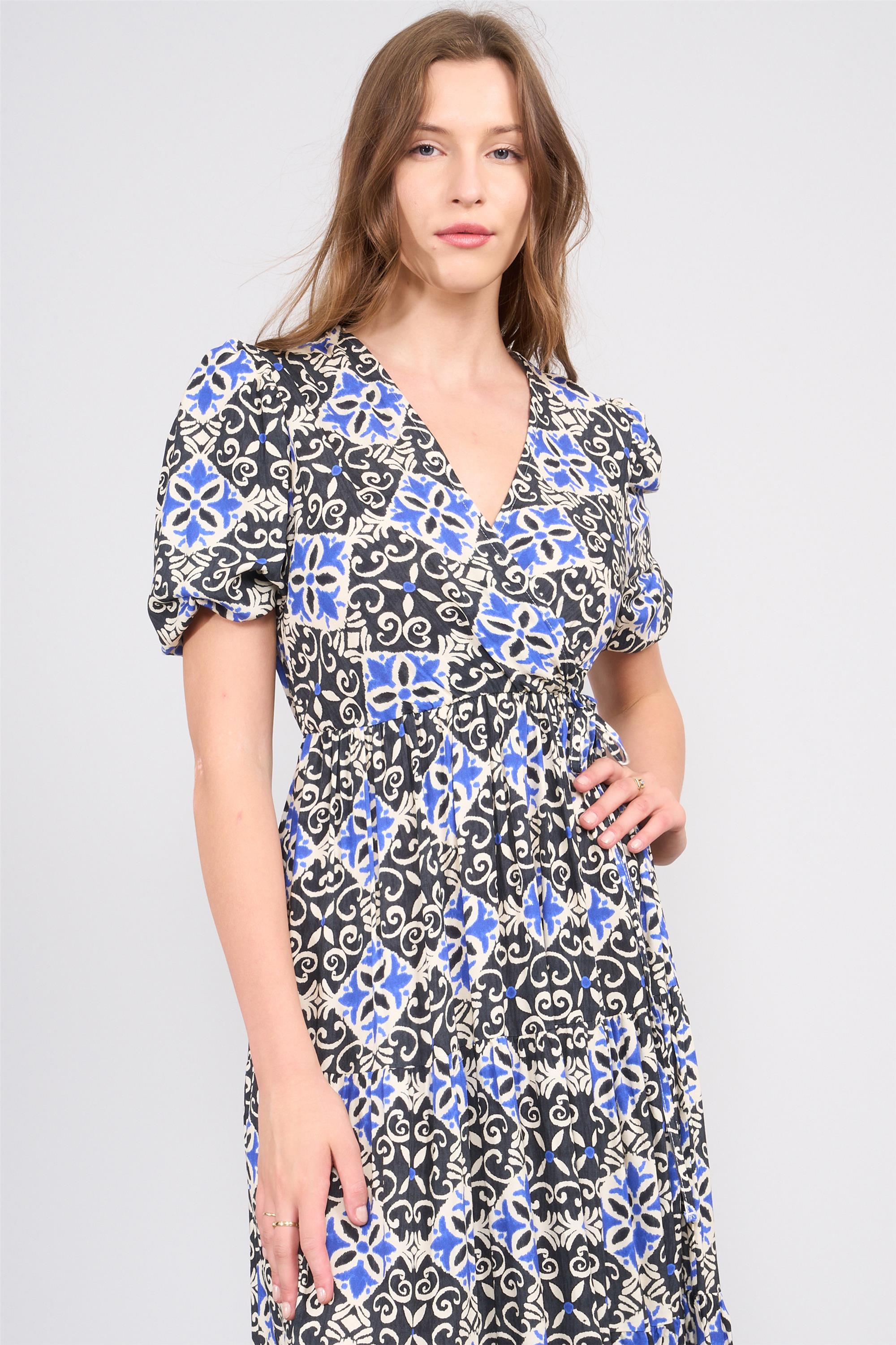 Ikoll Y25 1003056 Sıyah-Saks Kadın Kısa Kollu V Yakalı Karısık Desenlı Elbıse