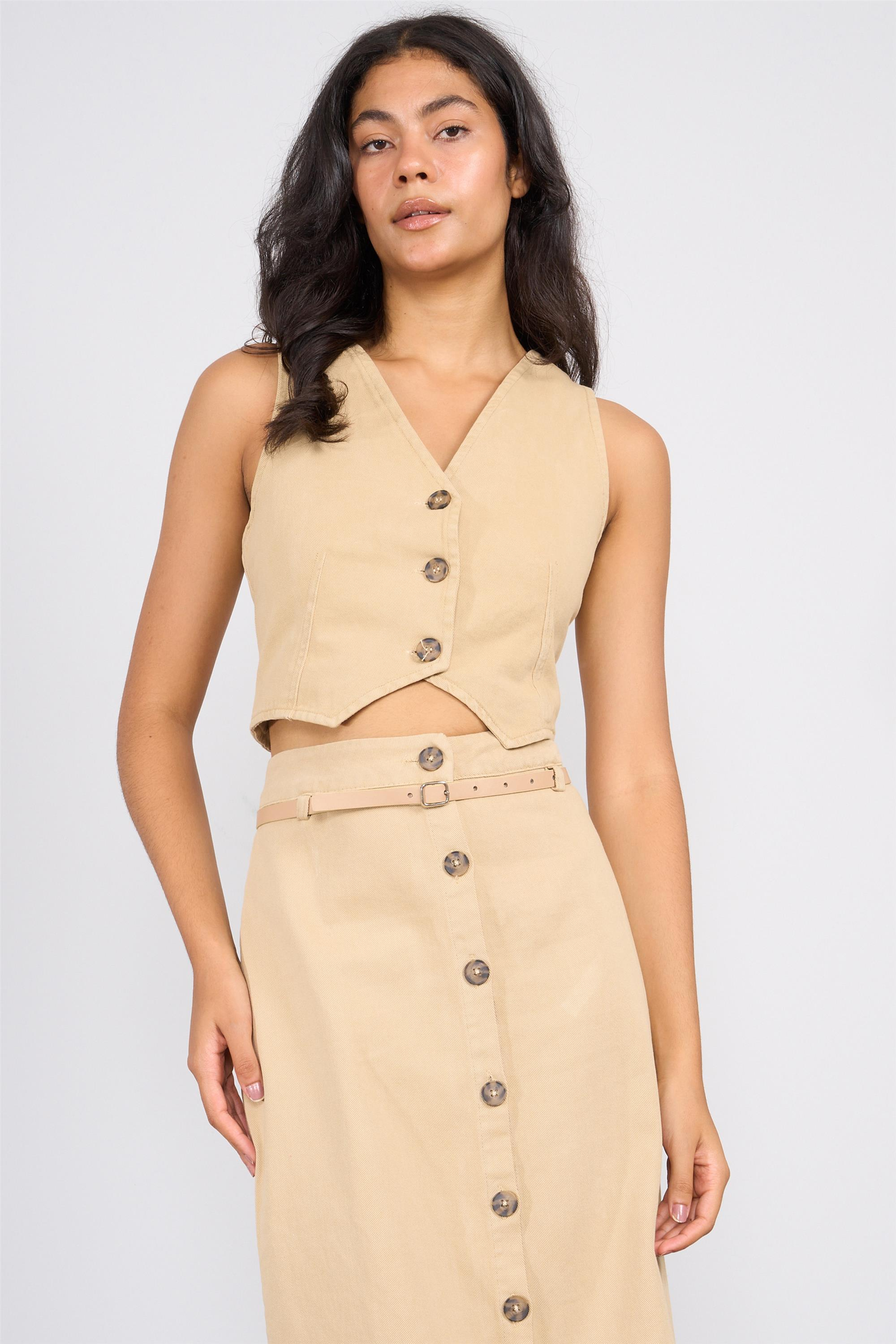Lefon Y25 220412 Camel Kadın Dugme Detaylı Kemerlı Yelek Ve Etek Takım