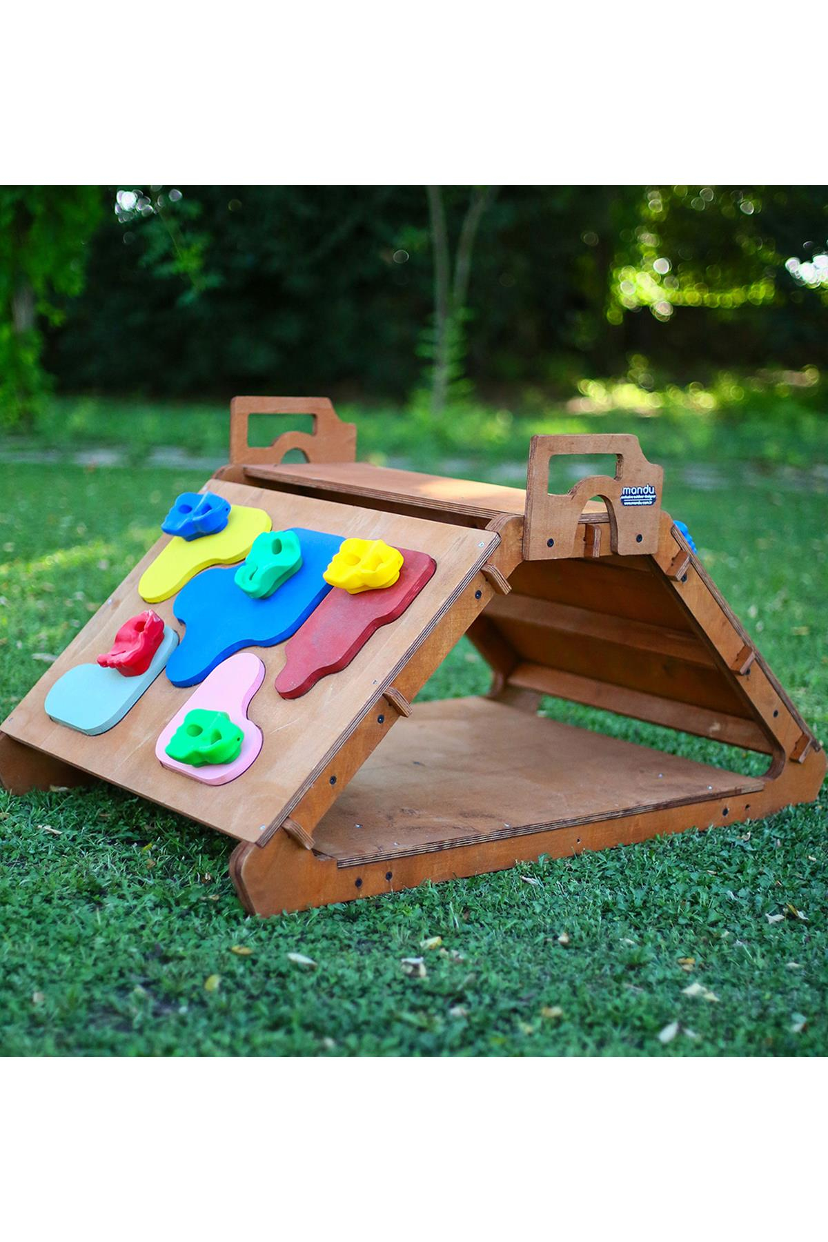 Dış mekâna uygun, üçgen form sayesinde stabil ve güvenlidir. Renkli tırmanış tutamaklı panel motivasyonu artırır; üstteki taşıma kulpları pratik yer değiştirme sağlar. Ayrıca ürünün hem altı hem üstü farklı işlevlere sahip! Alt bölüm, sürünme/tünel oyunu için değerlendirilebilir. Üst bölüm ise birden fazla alımlarda, taşıma kulpları çıkarılarak yan yana yerleşim ile denge/yürüyüş platformu işlevi kazanır.