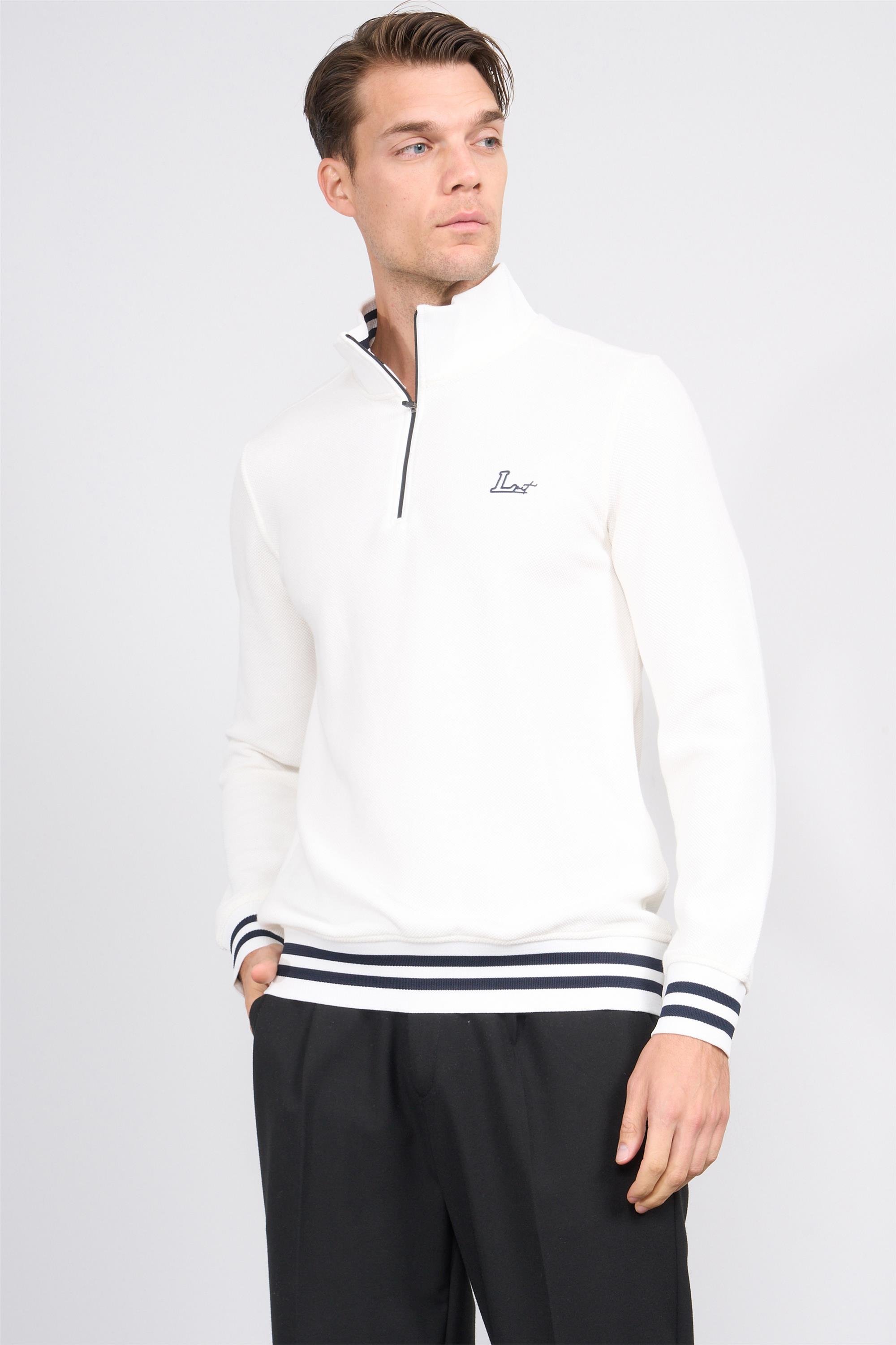 Troy Beyaz Erkek Çıtır Fermuarlı Çizgili Dik Yak. Sweatshirt